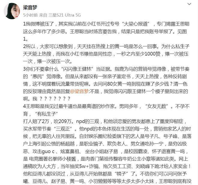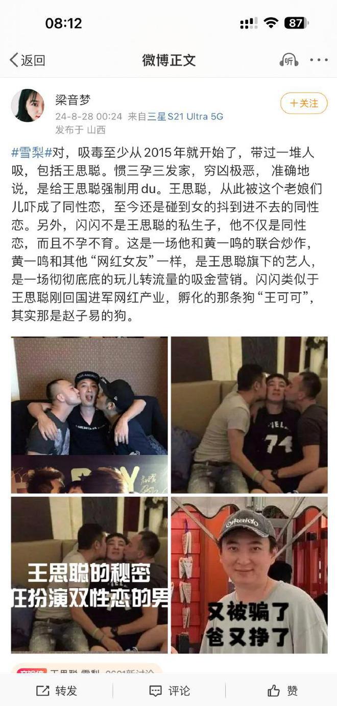 说雪梨和王思聪在一起,然后王思聪是同 X 恋,黄一鸣的女儿闪闪又不是王思聪的私生子,因为他不孕不育。