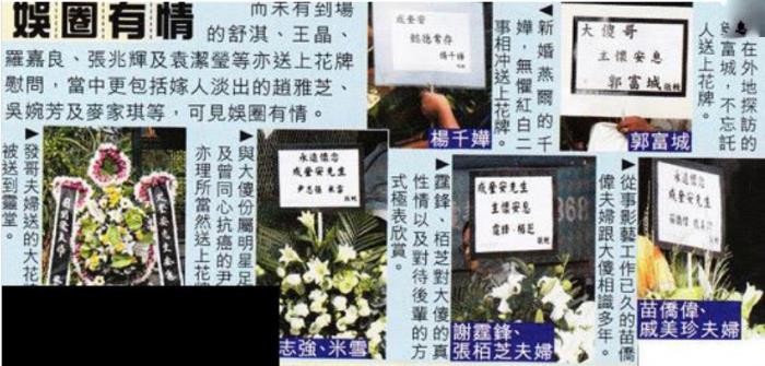 香港艺人谢霆锋、张柏芝、杨千嬅、郭富城、米雪夫妇等虽未列席,但均送来花牌深表痛心。