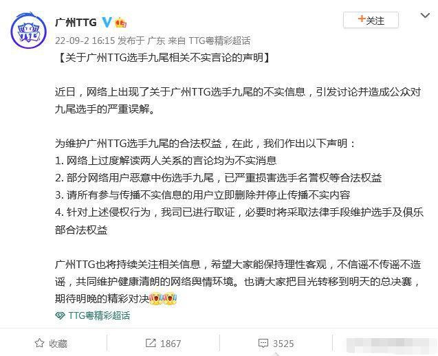 九尾方也表示公司已进行取证,网络上过度解读两人关系的言论均为不实消息,部分网络用户恶意中伤选手九尾,已严重损害选手名誉权等合法权益,希望大家能保持理性客观,把目光转移到总决赛上。