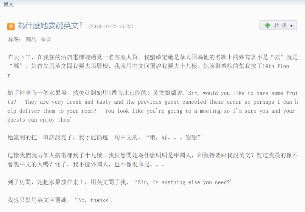 他在微博为台湾某牛肉面店被外国客人刁难而鸣不平,号召网友检举不遵守交通规则的公交车司机,多次发微博控诉飞机服务管理不当 ......