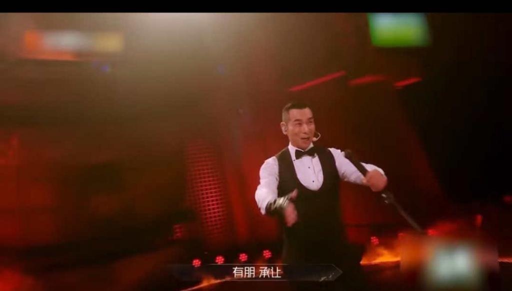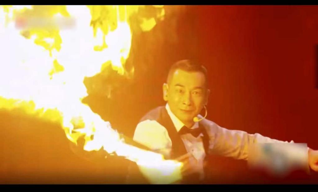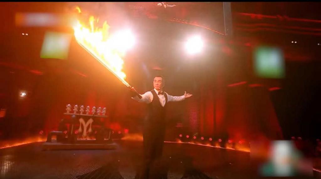 从现场照片中我们不难看出,赵文卓虽然身着西式马甲和小领结,整个人显得文质彬彬的,但是,丝毫不影响表演节目时的霸气。这不,当带火的长刀亮出的那一刻,便惊呆了所有在现场的嘉宾和观众。