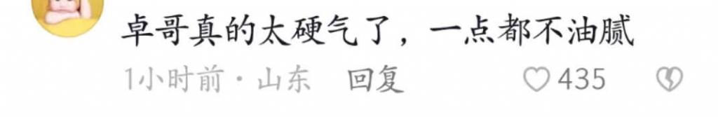 评论区的网友虽然没有到现场,但是,看了视频的他们都是像苏有朋这样的反应。有网友直呼:卓哥,真的太硬气了,一点都不油腻!