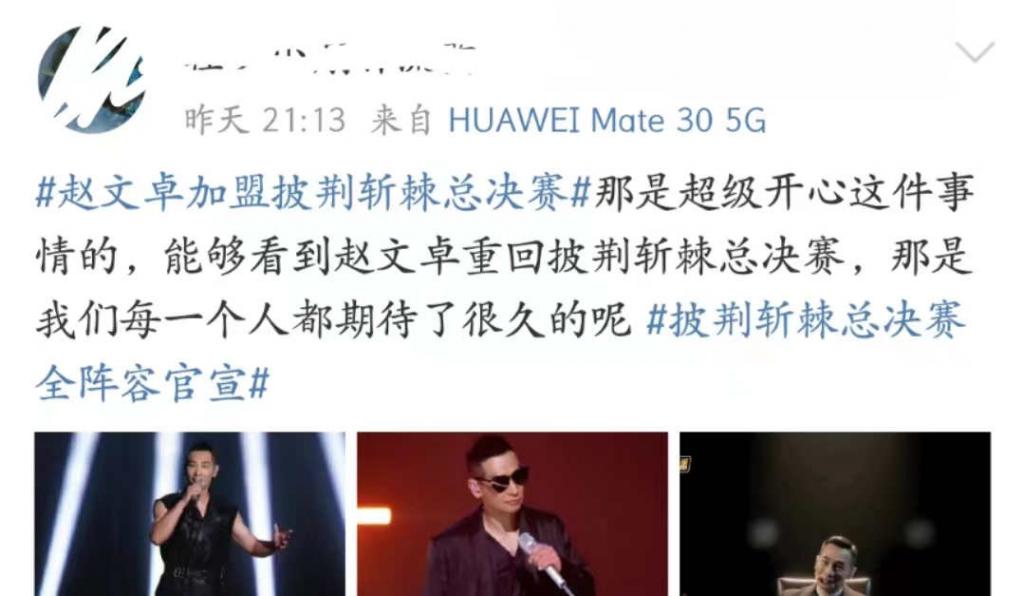 其实,早在比赛前一天,当节目组官宣晚上的总决赛嘉宾的时候,许多网友就已经开始十分期待赵文卓的表演。直呼:这是我们每个人都期待了许久的!