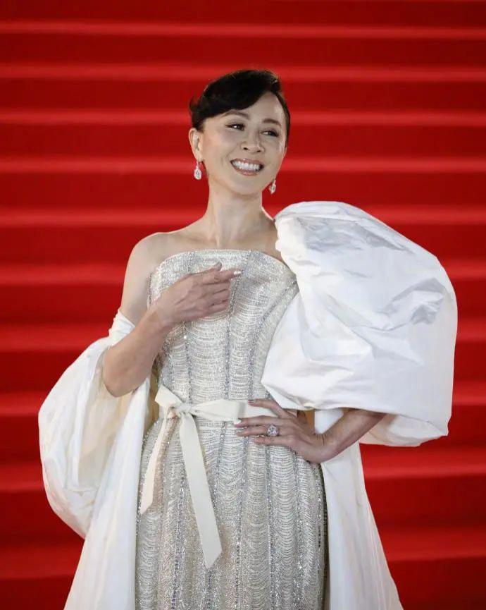 一直被网友调侃多年无作品的刘嘉玲,身穿一袭银白色抹胸长裙亮相红毯,快 60 岁的她依旧气场全开,大方走上颁奖台替老公梁朝伟领奖。