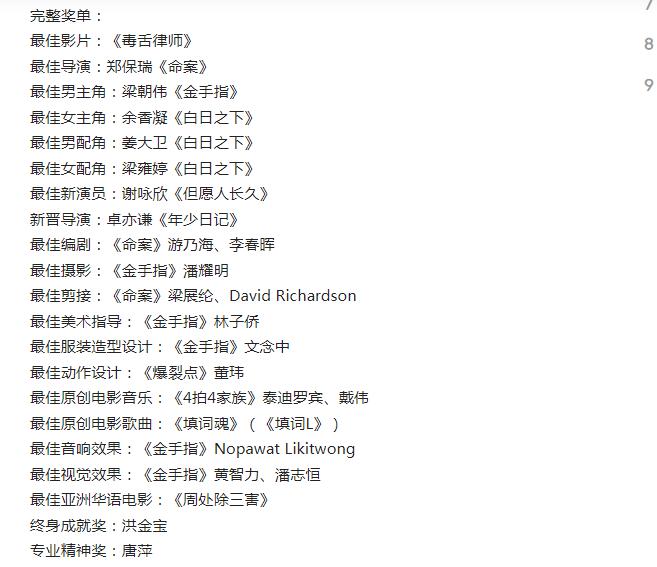 " 今年赛果最佳影片《毒舌大状》,女主余香凝,女配梁雍婷,男配姜大卫都是实至名归,尤其 John 哥,应该给他了。