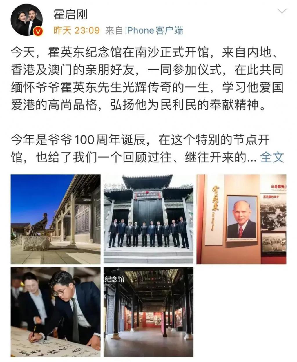 霍启刚虽然很少拿爷爷出来晒,却也难免为有如此爷爷而感到自豪,对爷爷的传奇一生和爱国爱港的高尚品格骄傲,曾在霍英东纪念馆在南沙盛大开馆那日激动地发长文表达敬意。