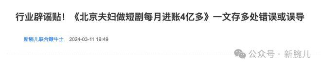 1、行业辟谣贴!《北京夫妇做短剧每月进账 4 亿多》一文存多处错误或误导 http://www.bianews.com/news/details?id=180837 2、辟谣帖!咪蒙两部剧收入过亿?《八零后妈》消耗破 8 亿? http://www.bianews.com/news/details?id=179524 3、夫妇做短剧月进账 4 亿多?当事方披露:净利不足 1%,爆款不到 10%,三成项目血本无归 https://mp.weixin.qq.com/s/iAnlSh2SSsn24hv5vhCaMQ