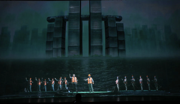 记者看到,在舞台设计上,《一江清水向东流》从中国古代青绿山水画中寻找灵感,利用LED屏和镜面的组合,与灯光影像相配合,一开场就展示了重庆地标朝天门码头夜景的3D效果,让人耳目一新。