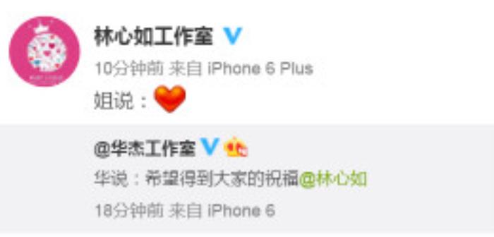 2016年5月20日霍建华工作室发出微博认爱,"华说:希望得到大家的祝福"并@林心如,随后林心如工作室回复了一个爱心。