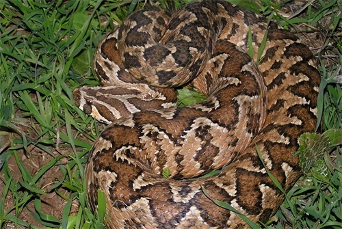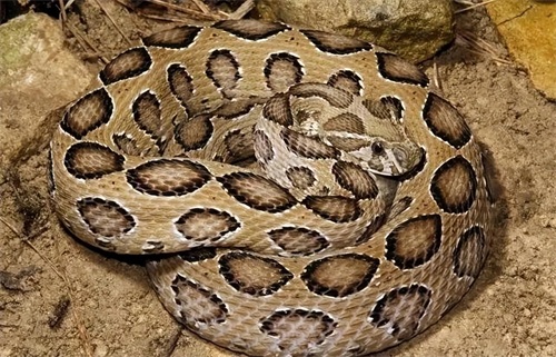 若你碰到一条,体型粗长,浅色的表面浮现着各种棕色的圆形对称斑点,其中又以身体最中间的一排圆形斑点最大的毒蛇,这家伙叫做圆斑蝰。