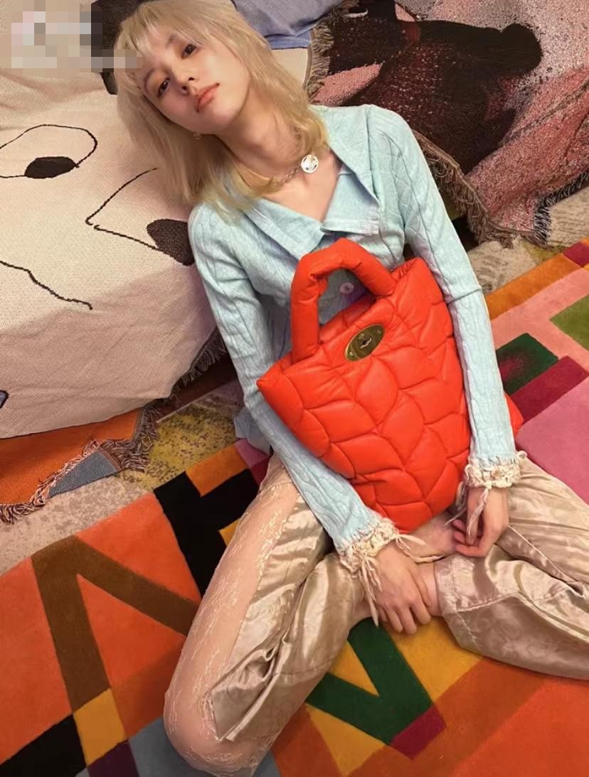 照片中的她穿着蓝色衬衫,提着红色包包,下身一条拼接白色蕾丝的裤子,整体打扮十分有个性。