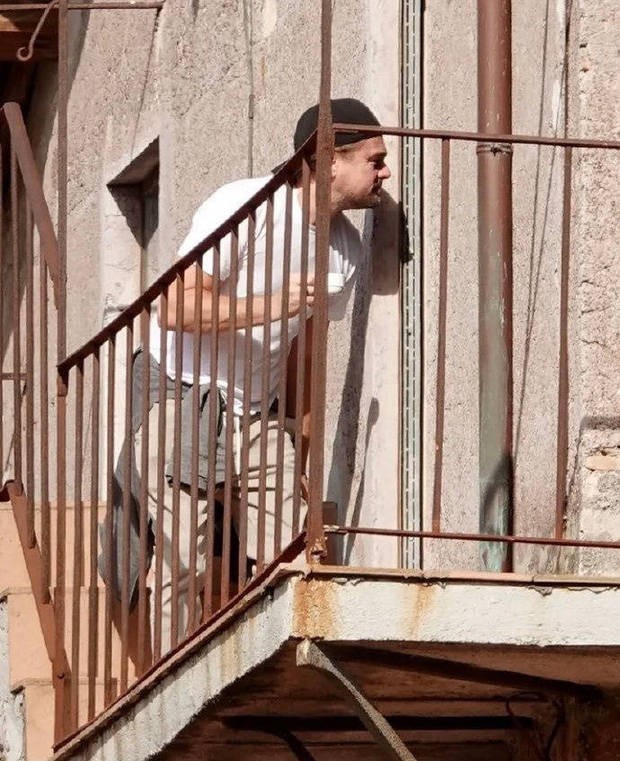 小李子与26岁超模女友一起坐在户外楼梯上享受日光浴。
