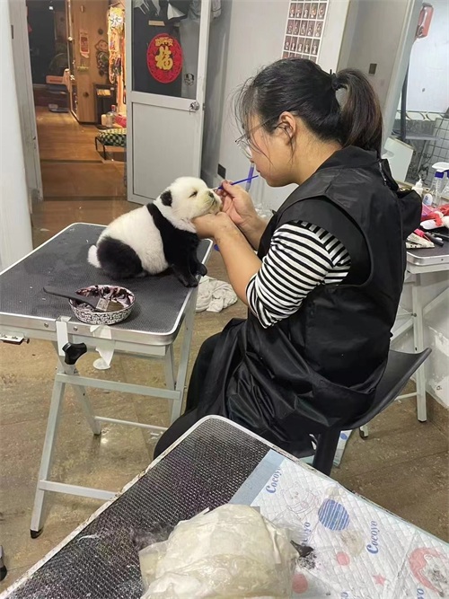 茅红君:今年3月,我们在宠物市场看到别人将博美犬染成熊猫的样子,觉得挺有新意的,也想尝试一下。但我们觉得博美犬体型不够壮硕,不像熊猫,于是决定把这个想法再优化、改进,用松狮犬代替博美犬。