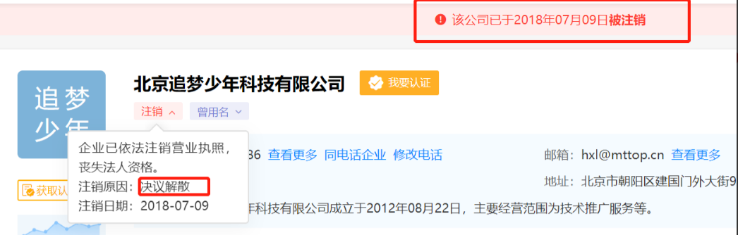 2018年,追梦少年科技公司黄晓明退股,公司注销。