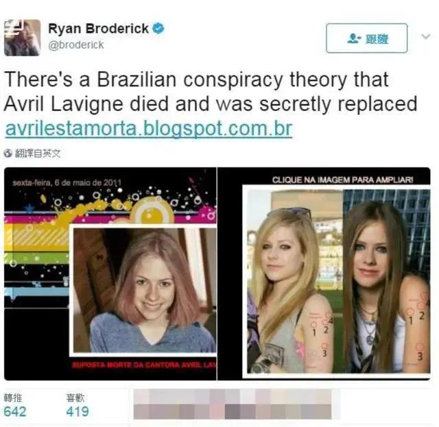 ▲美国记者 Ryan Broderick 于 2015 年在转发,让「艾薇儿已死」如病毒般传播。