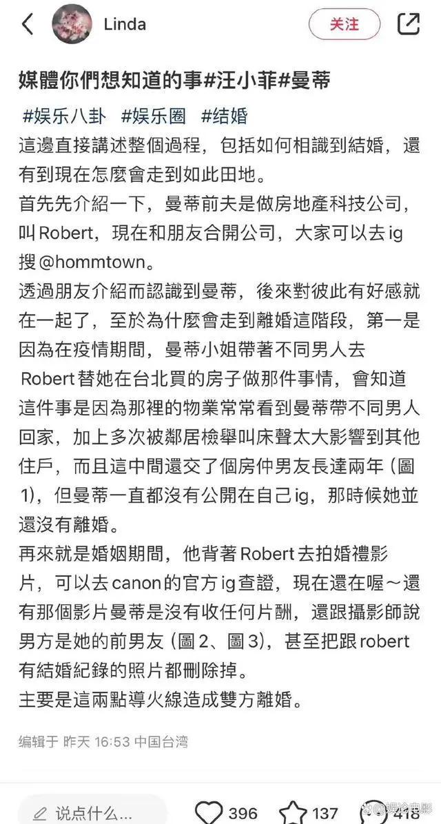 湾湾网友的爆料,说曼蒂的前夫是做房地产科技公司,叫 Robert, 现在和朋友合伙开公司,还透露其 IG 账号。