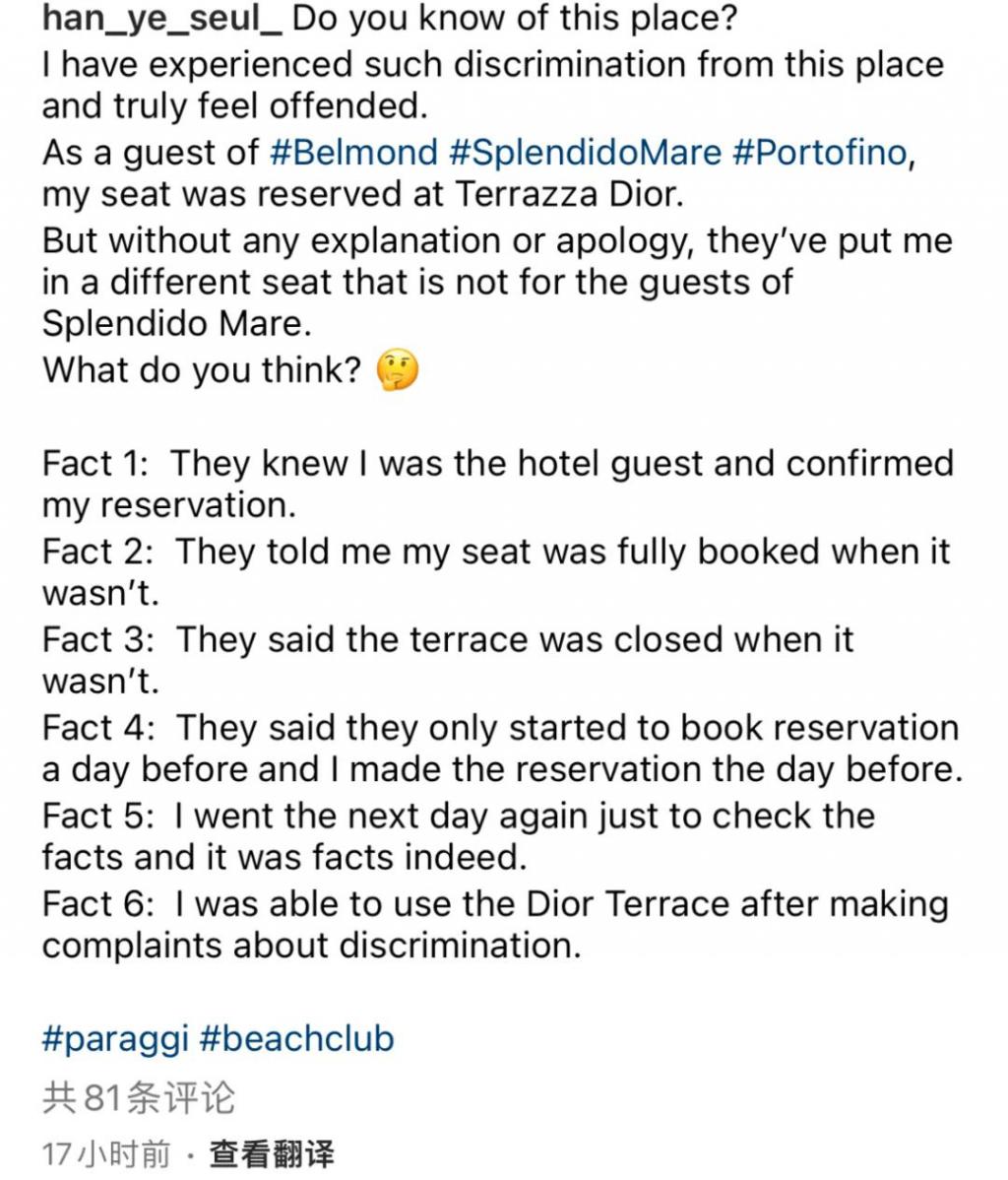 韩艺瑟:你们知道这个地方吗?我在这个地方经历了这样的歧视,真的感到被冒犯了。作为 #Belmond#SplendidoMare#Portofino 的客人,我在 Terrazza Dior 预订了座位。但在没有任何解释或道歉的情况下,他们把我放在了一个不适合 Splendido Mare 客人的位置上。你们怎么看呢?