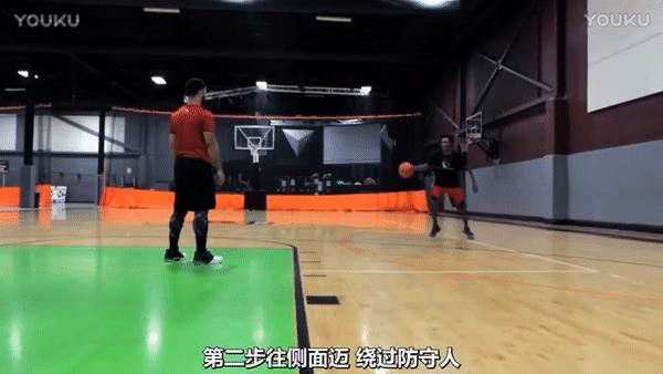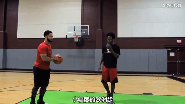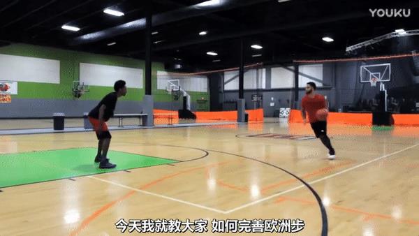 另外欧洲步之前可以加一个虚晃动作,持球前进时候,用持球手快速出球到另一个手,然后加一个反方向的晃肩接着进行欧洲步,这个动作比较难,前面的熟练后可以进行练习这一个。