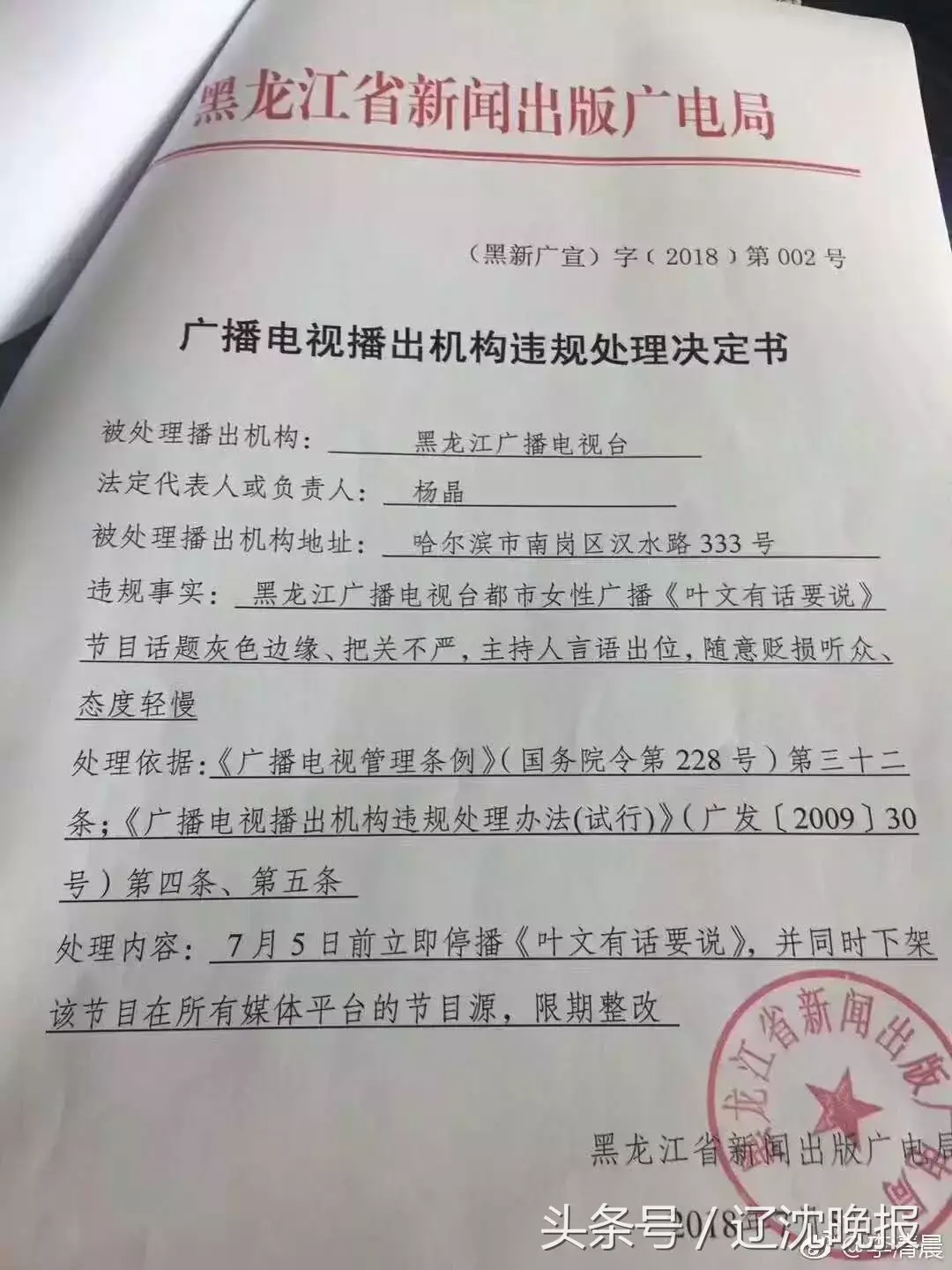 日前有传闻称,黑龙江广播电视台都市女性知名节目《叶文有话要说》,被黑龙江省新闻出版广电局认定违规,并勒令在7月5日前停播,同时下架该节目在所有媒体平台的节目源,限期整改。