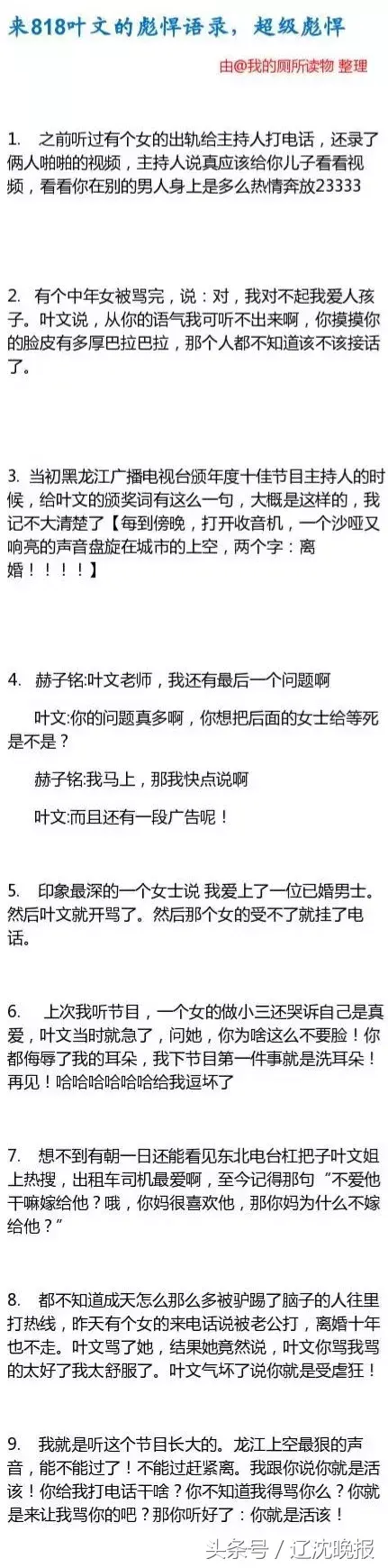 从选题上,《叶文有话要说》比较重口味,打电话进来咨询的都是一些情感婚恋难题,什么未婚同居、丈夫出轨、有女儿的女人给人当情妇等等,基本上生活中的奇葩事儿都能在这个节目里听到。