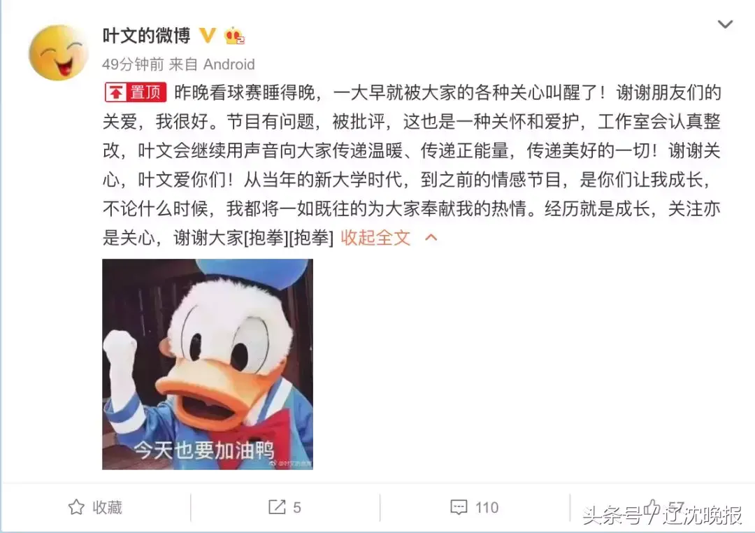 今日,叶文在官方微博发文表示,节目有问题,被批评,这也是一种关怀和爱护,工作室会认真整改,叶文会继续用声音向大家传递温暖、传递正能量,传递美好的一切!