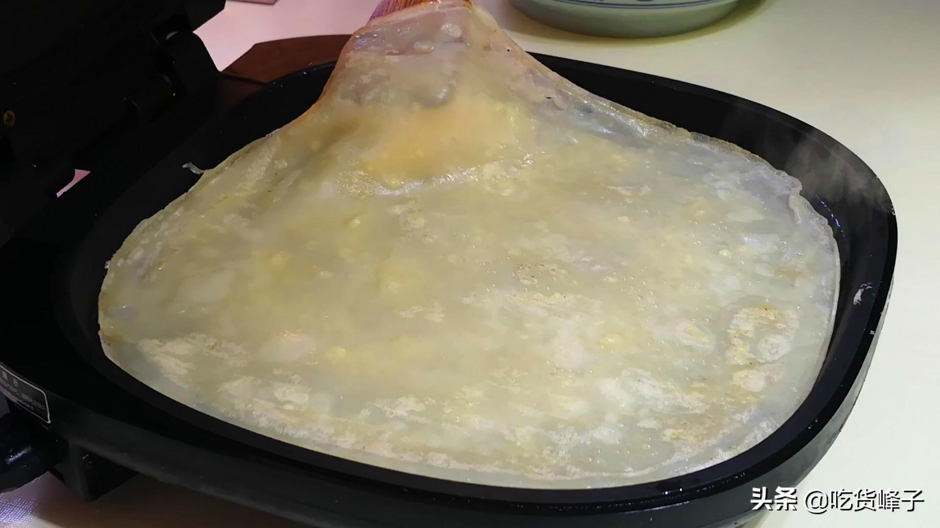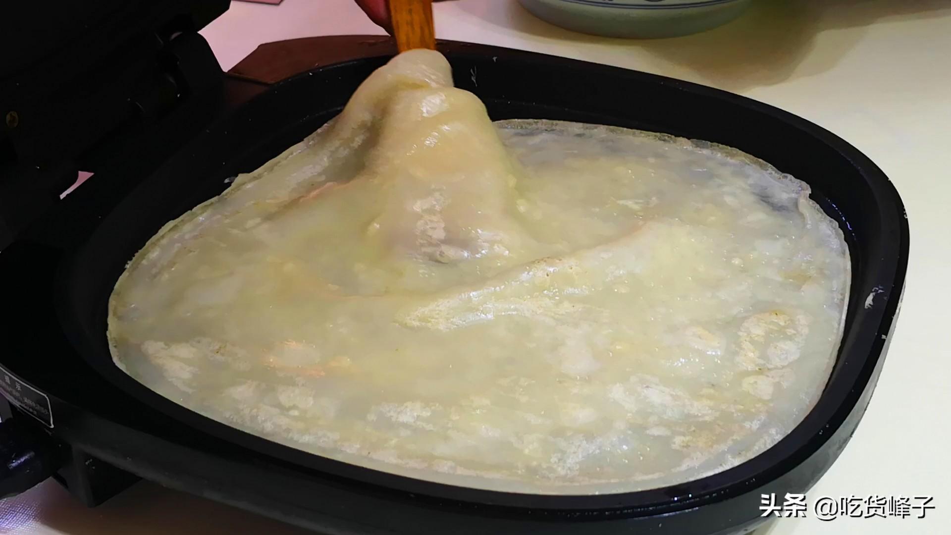 热锅凉油是电饼铛做凉皮成功的关键,这样做凉皮不粘锅,火候刚刚好,大约30秒就能做一张。
