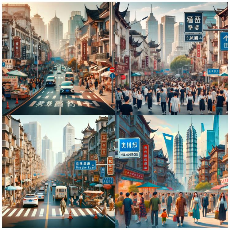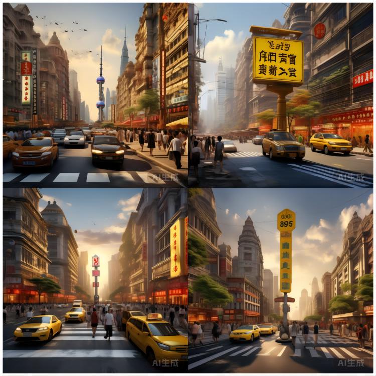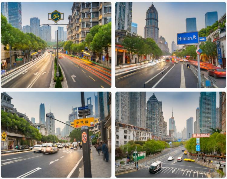 短评:繁华的街头表现不错,第四张图片也能看出来是上海的标志性建筑上海环球金融中心 "。而且虽然中文表现不好,但是可以看到正确拼写的英文 "huanghe Road",画面质量也不错。