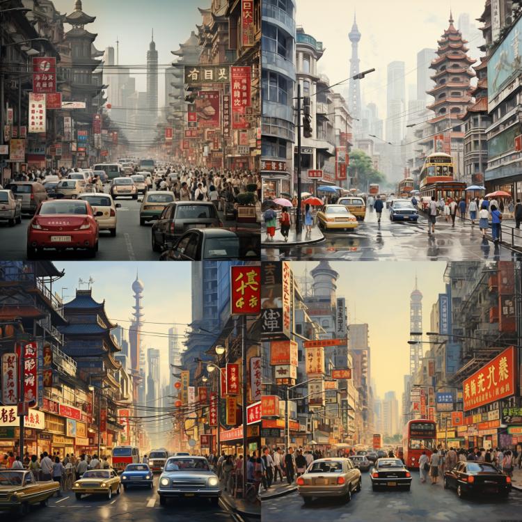 虽然没有一个模型看起来像是黄河路,但是不少对于上海都有的正确的表达。特别是 Midjouerney 刚刚更新 V6 版本呢,不仅仅正确展现出来了上海的建筑风格以及繁华的街头场景,而且文本表达能力相当出色。当然,中文能力另算。