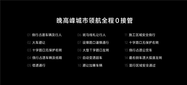 可以看到小米汽车在自动驾驶时,遇到了绕行占道车辆及行人、避让大车、十字路口无保护右转、绕行占道车辆及纸箱、借道通行、斑马线礼让行人、设障路口谨慎通行、大型 T 字路口左转、自动变道超车、避让加塞车辆等。