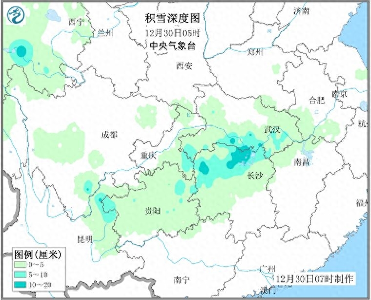 12月30日,随着水汽在我国南方地区开始活跃,南下的寒潮正在长江流域形成大范围的雨雪天气。在这其中,贵州、湖南、湖北等地成为降雪中心。