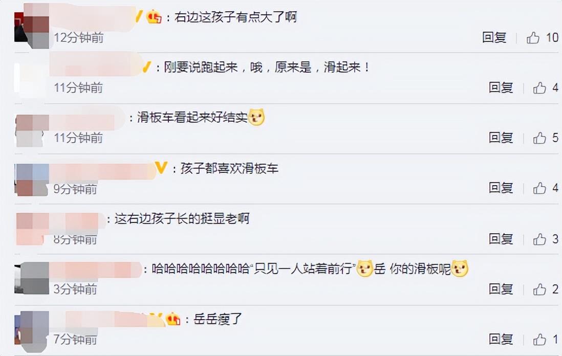 不过,网友的关注点似乎还是放在骑着滑板车的小岳岳身上,纷纷留言调侃:“右边这孩子有点大了啊”、“只见一人站着前行,岳,你的滑板呢”、“刚要说跑起来,哦,原来是,滑起来”。