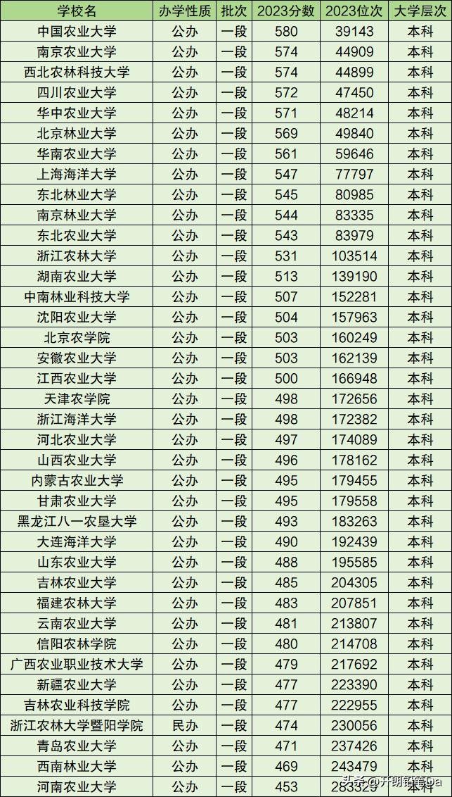 2023年各农林类本科院校录取最低分一览表: