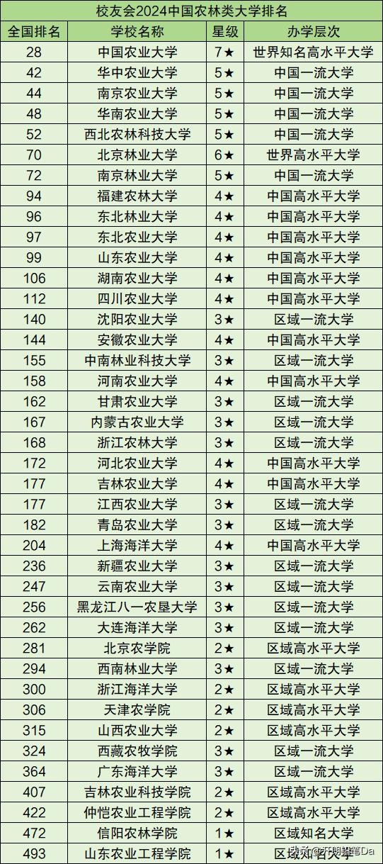 根据校友会2024年中国大学排行榜,农林类大学中实力最强的当属中国农业大学,学校以全国第28名位居该类院校榜首,也是农林类大学中唯一一所世界知名高水平大学(7星级)。