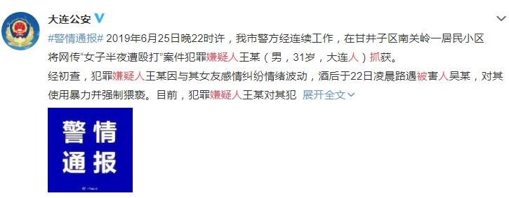 直到6月25日下午3点25分,大连公安发布了警情通报,事发案件确认大连。系2019年6月22日凌晨1时许,发生在甘井子公安分局华东路派出所辖区的一起警情。经查,被害人吴某(女,29岁,辽宁盘锦人)当夜在回家途中被一男子殴打,吴某拨打110报警。接警后,甘井子警方连夜立即开展工作,并抽调精干警力成立专案组,全力开展案件侦破工作。”