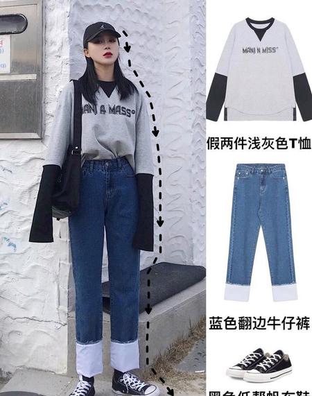 高个子小仙女们这样穿也超级好看。一件拼接的灰色长T,下身再搭配一条蓝色的翻边牛仔裤,看起来时尚又帅气,再搭配一双简单的帆布鞋,又多了几分运动风。