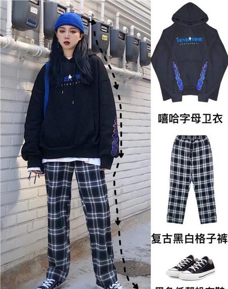 越来越喜欢这种又A又酷的穿搭,这种风格特别适合高个子女生。小姐姐利用一件嘻哈风的黑色字母卫衣,下身再搭配一条复古格纹裤,再搭配一顶蓝色毛线帽,一套简直不要太A。