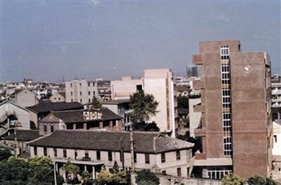 校景鸟瞰,外为学校大门,褐黄色五层楼为图书楼。钟楼为中山厅,后为大食堂,左面黄色、绿色者为教学楼(摄于1987年)