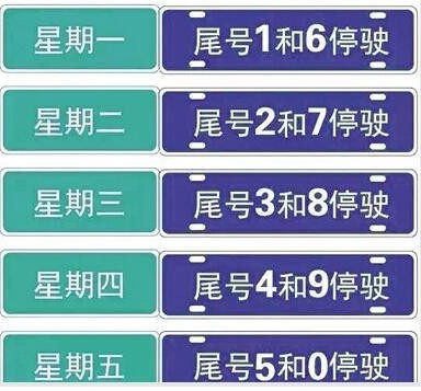 星期一:限行机动车车牌尾号1和6;星期二:限行机动车车牌尾号2和7;星期三:限行机动车车牌尾号3和8;星期四:限行机动车车牌尾号4和9;星期五:限行机动车车牌尾号5和0。