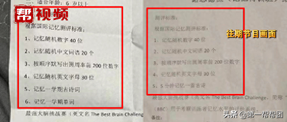 家长们说,当时机构负责人承诺,上了培训班之后,孩子的记忆速度会快速提升,在提供给家长们的记忆特训班结业标准上,更是写有能让孩子按顺序默写出圆周率前200位数字等。