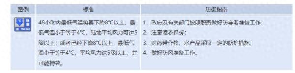 受强冷空气影响,10—12日我省将出现寒潮、雨雪和大风天气:全省大部地区过程降温幅度8~10℃,局部16℃以上,最低气温出现在12日早晨:菏泽、济宁、鲁西北和鲁中地区-7~-5℃,局部-9℃,其他地区-3~0℃。我省偏北风将逐渐增大:10—11日,滨州、东营、潍坊、日照、内陆湖面和半岛地区5~6级阵风7~8级,其他地区4~5级阵风6~7级。