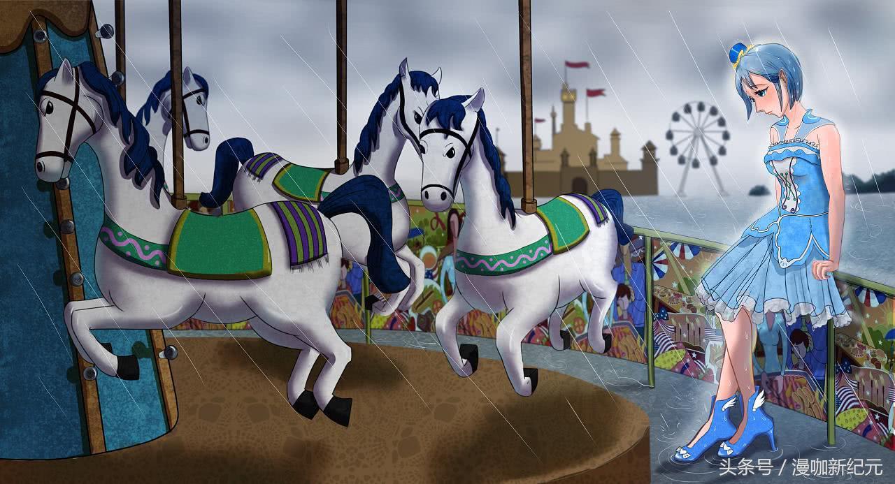 真爱粉大触当然也有脑洞大开的时候,下面这幅同人图就是,看背景应该是在游乐园的旋转木马旁边,本应是一个充满欢乐的地方,但是图中空无一人,天色阴沉还下着雨,小月一个人淋着雨孤独的靠在栏杆上,真是看着就让人心疼,抱抱你,小月!