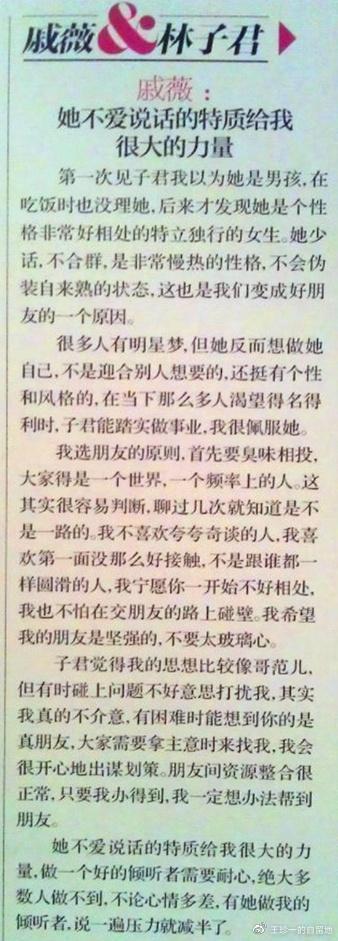 接受采访时,林子君表示,在她看来,戚薇为人仗义、坚强、坚持又孝顺,让她十分欣赏。