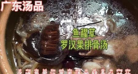 排骨洗净加冷水煮沸,去油去浮沫,清洗干净备用,鱼腥草洗净打成小结,罗汉果三分之一只,红枣去核,一起下锅大火烧开后十五分钟,排骨熟通放盐调味即可食用。有清热解毒的功效,夏天汤品必备。