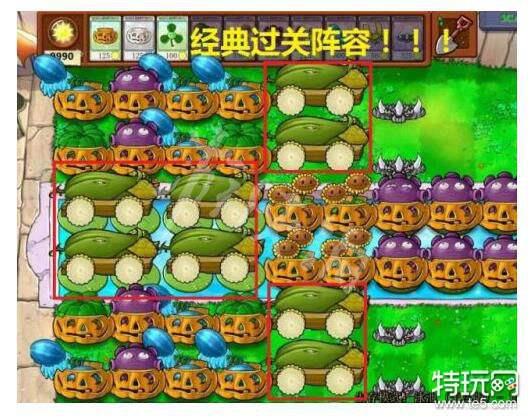 下面的经典阵容大家肯定都知道了。还是用冰西瓜来减缓速度,让玉米炮有足够的时间准备然后给丧尸致命一击。而且植物后面还有蓝蘑菇和生菜,可以被蹦极僵尸或者小鬼僵尸的突然袭击有效杀死。