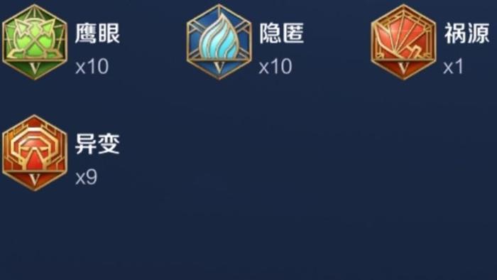 红色九异变一祸源蓝色十隐匿绿色十鹰眼铭文方面我们选择以百穿为主,红色带一个祸源是为了增加我们的普攻暴击率输出敌人,带十个隐匿也是为了伤害最大化!