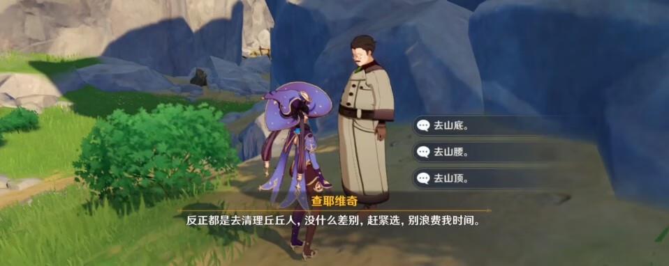 要求玩家三选一,去山底、山腰、山顶清理丘丘人。