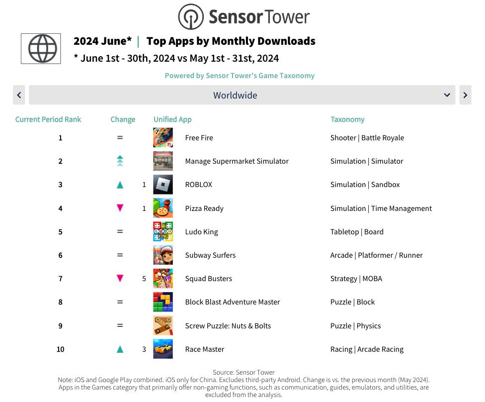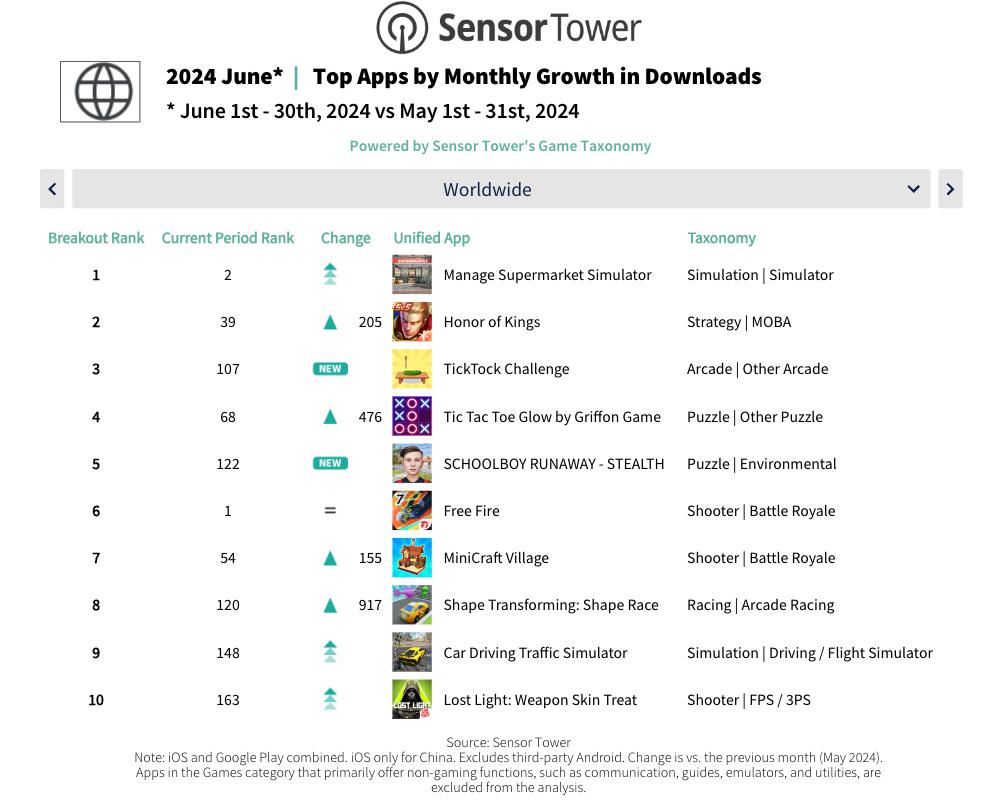 7 月 31 日,Sensor Tower 公布了 6 月移动游戏在全球市场的下载和收入情况。