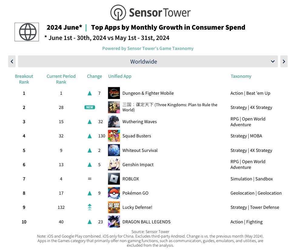 由腾讯发行的国服版本《地下城与勇士:起源》,在 2024 年 5 月登陆中国市场,并在 6 月吸金近 2.51 亿美元(合约人民币 18 亿元),成为本期收入最高的手游。