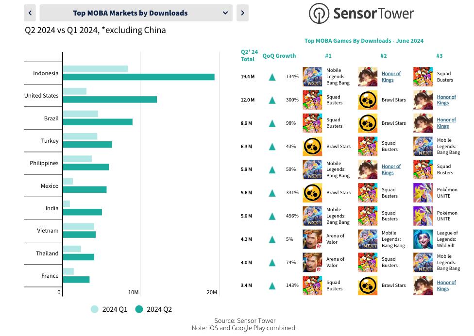 此外,MOBA 新游《Squad Busters》位列下载榜第 7 名,全球收入超过 4500 万美元,下载量近 5100 万次。
