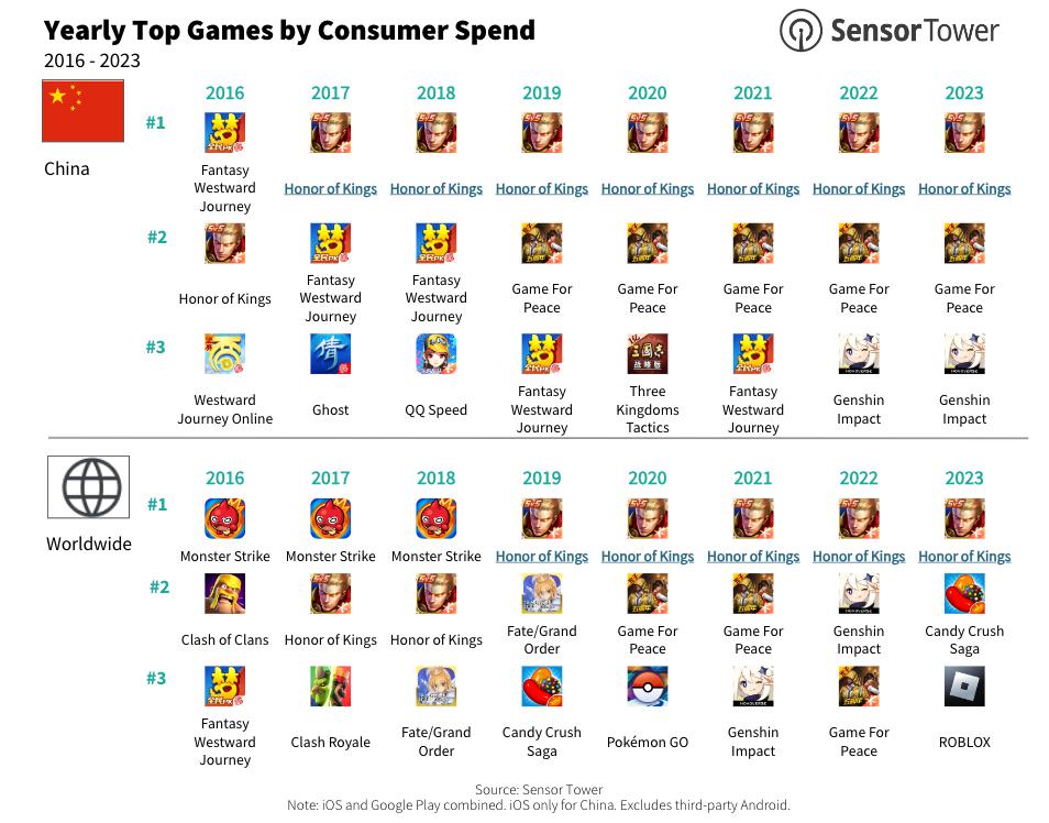 2024 年 6 月,腾讯《王者荣耀》跻身全球手游下载量增长榜第二名。从全球范围来看,该游戏在 2025 年至 2025 年间,凭借在中国 iOS 市场的收入,该游戏位列全球 iOS 和 Google Play 双平台总收入榜单第一名。
